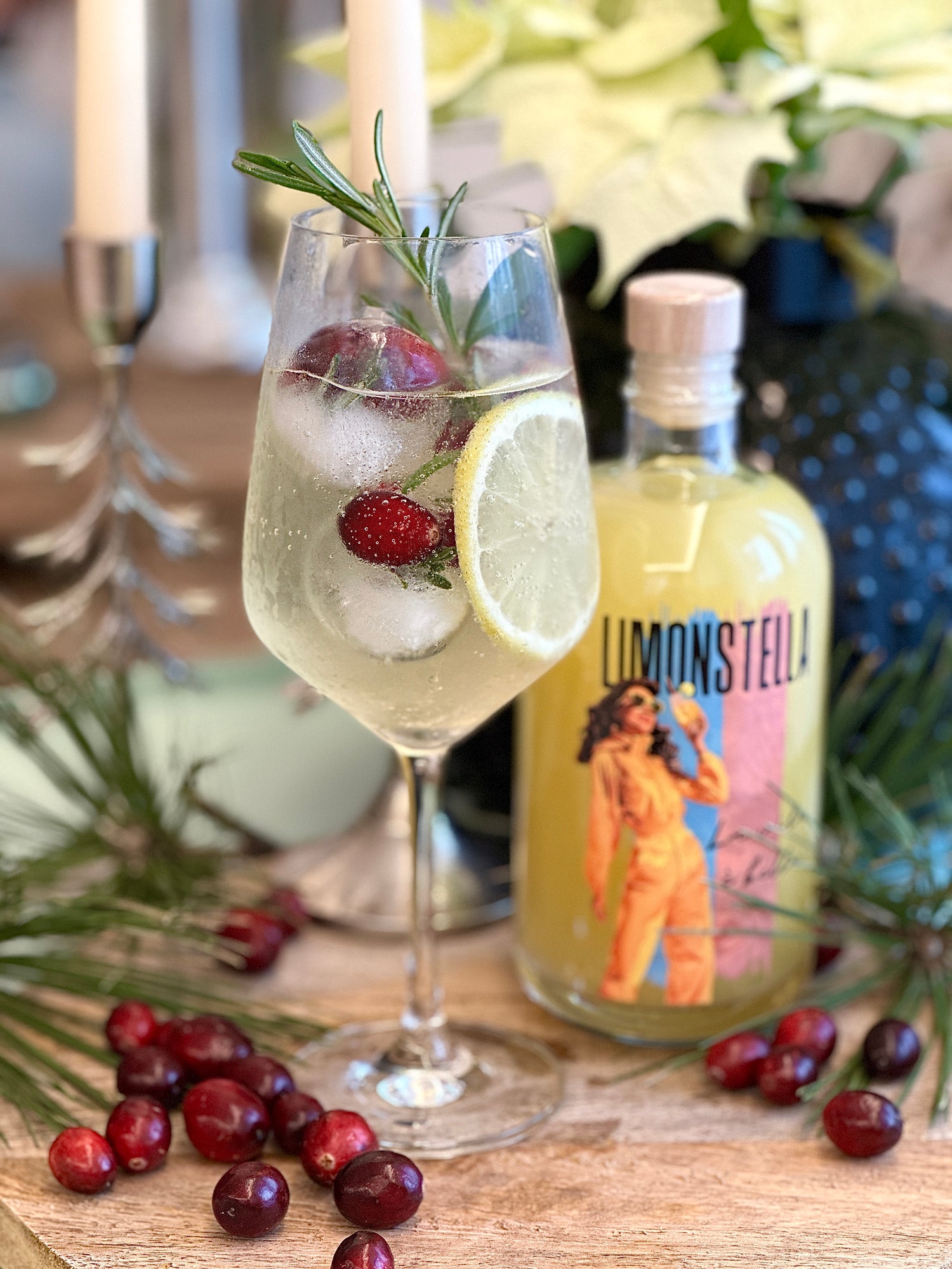 Eiswürfel, Limonstella, Mineral und Prosecco ins Glas geben und mit Zitrone und Rosmarin oder Pfefferminze verzieren.